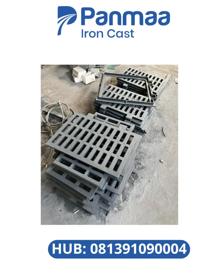 - Penuangan dan Pembentukan: Cairan besi dituangkan ke cetakan, membentuk grating dengan pola grid yang kokoh dan saluran drainase yang lancar.