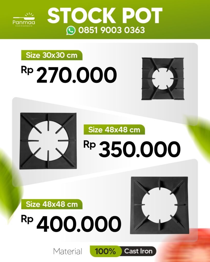 Tatakan Kompor Stockpot adalah penyangga besi cor khusus untuk menempatkan panci stockpot berukuran besar (diameter hingga 50 cm) di atas kompor, memastikan kestabilan dan distribusi panas optimal. Produk Panmaa Iron Cast ini disesuaikan dengan kebutuhan Bekasi, di mana dapur komersial sering menangani volume masakan besar seperti rendang atau makanan olahan pabrik. Ukuran 50cm x 50cm membuatnya ideal untuk kompor industri, mencegah kecelakaan dan mempercepat proses memasak.